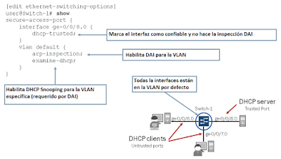 En los switches EX, el DAI viene deshabilitado por defecto. Para habilitar DAI, lo hacemos por VLAN y no por puertos.