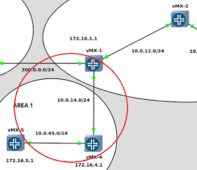 Luego es vMX-3, que es un ABR, el que convierte este LSA de tipo 7 a uno de tipo 5 y lo introduce en el dominio OSPF.
